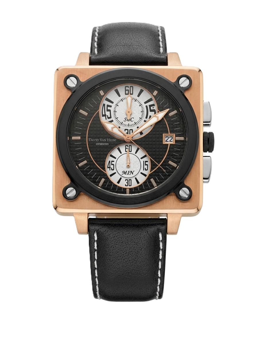 Its design is a tribute to the thigh-mounted navigation watches used by reconnaissance pilots, which were fixed onto square plates and strapped over flight suits. David Van Heim envisioned a “chassis” case: a robust square base secured by four structural bolts, mimicking the rivets used to fasten flight harnesses.