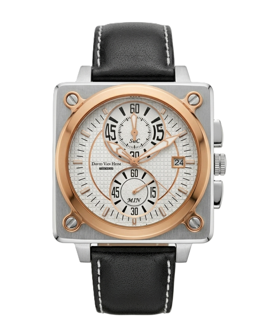 Its design is a tribute to the thigh-mounted navigation watches used by reconnaissance pilots, which were fixed onto square plates and strapped over flight suits. David Van Heim envisioned a “chassis” case: a robust square base secured by four structural bolts, mimicking the rivets used to fasten flight harnesses.