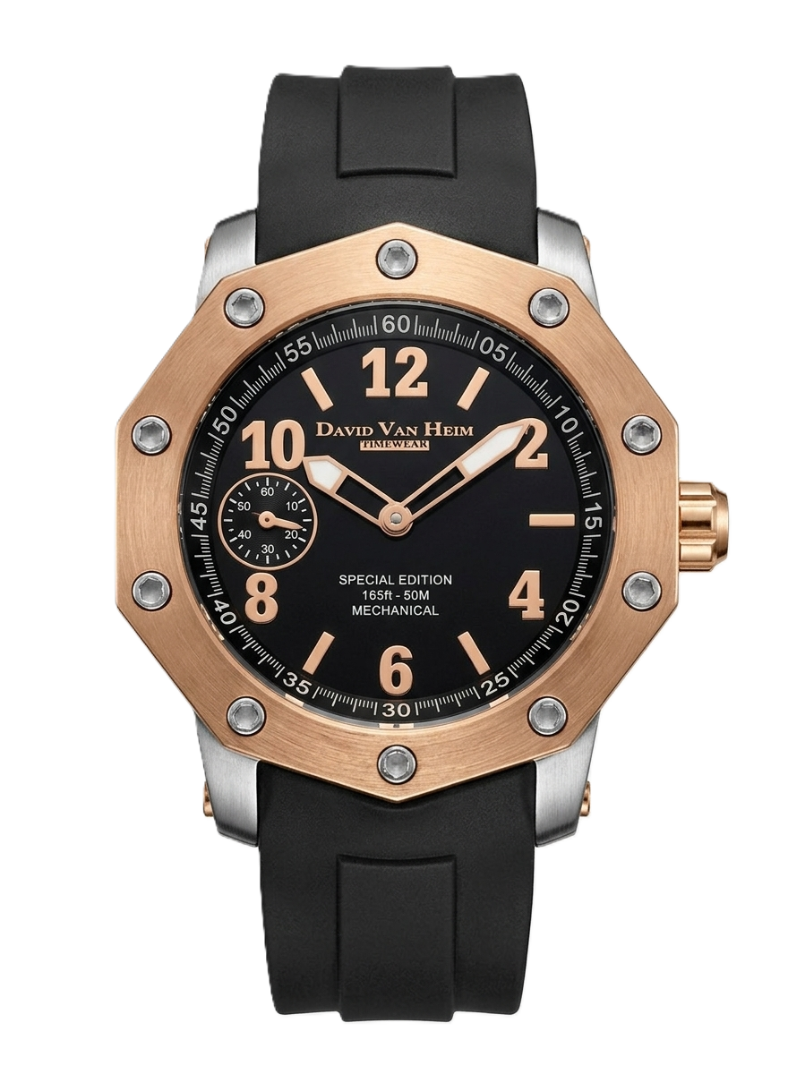 Inspired by the architecture of carbon-ceramic brakes, the Titan Hexa celebrates high-end racing engineering. Its brushed black bezel and eight visible bolts are a direct reflection of competition braking systems. The technical rubber strap and high-contrast dial complete this ultra-performance cockpit look. A raw, solid instrument built for those who master power.